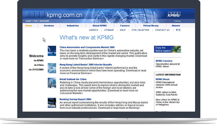 新鴻儒結(jié)合會計行業(yè)做事嚴謹、信息明了的特點,為畢馬威打造以“信息”為主體的品牌官網(wǎng)