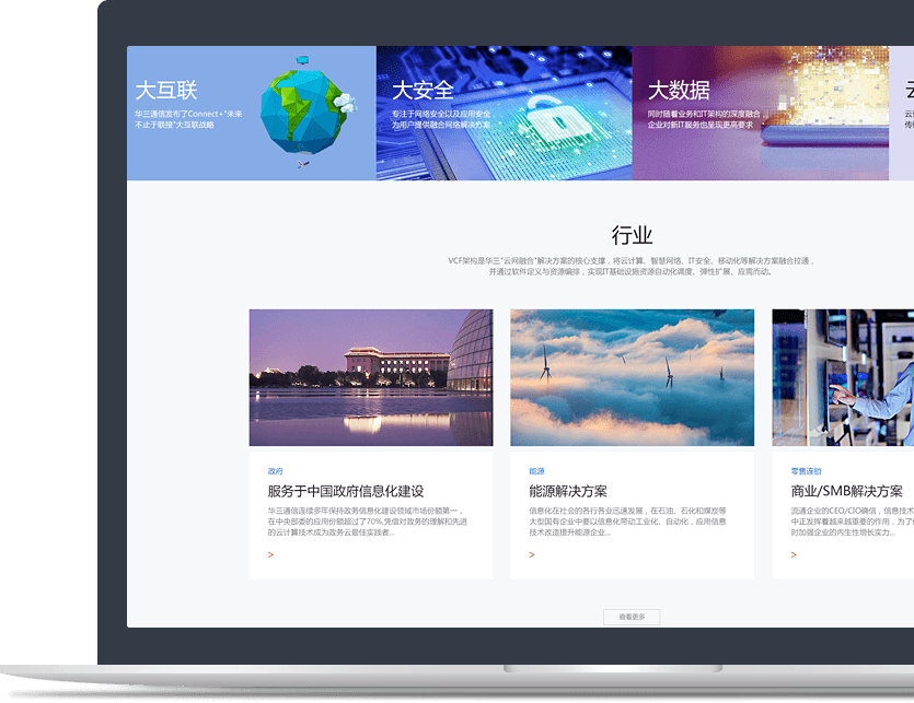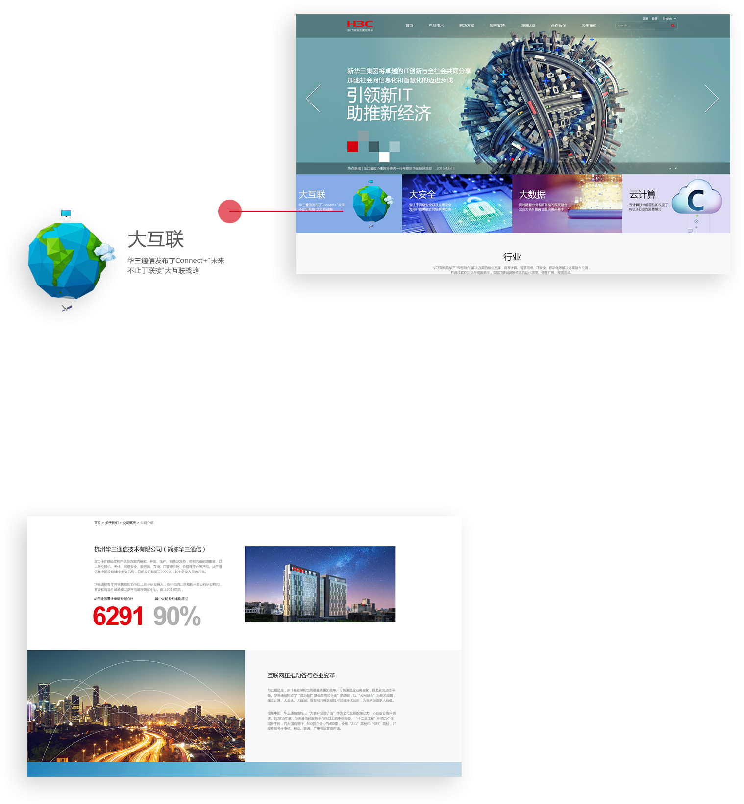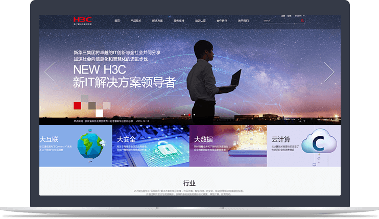 將“科技感”“創(chuàng)新力”融入品牌官網(wǎng),順應(yīng)色塊化的流行趨勢(shì),從視覺(jué)、交互、情感多維度提升品牌感知力, 成功打造H3C在互聯(lián)網(wǎng)領(lǐng)域的品牌標(biāo)簽。