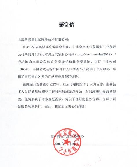 北京奧運氣象服務(wù)中心在此次項目中看到了新鴻儒的實力和努力! 并對北京奧運會氣象服務(wù)網(wǎng)站高度滿意,特此發(fā)來表揚信,以示鼓勵和贊揚!