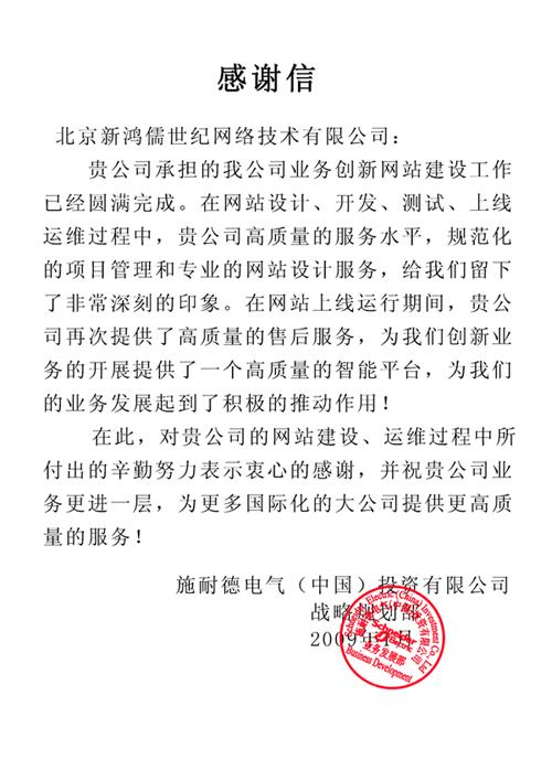 20091月施耐德電氣特此發(fā)來了表揚(yáng)信,這是對我們工作的認(rèn)可,也是對我們?nèi)蘸笄靶邪l(fā)展的鼓勵,簡簡單單的幾句評價(jià)就為新鴻儒的前行增添了力量。新鴻儒堅(jiān)信不會辜負(fù)客戶的希望,會在不斷改善自己的同時,飛得更高做得更好來回饋給你們。