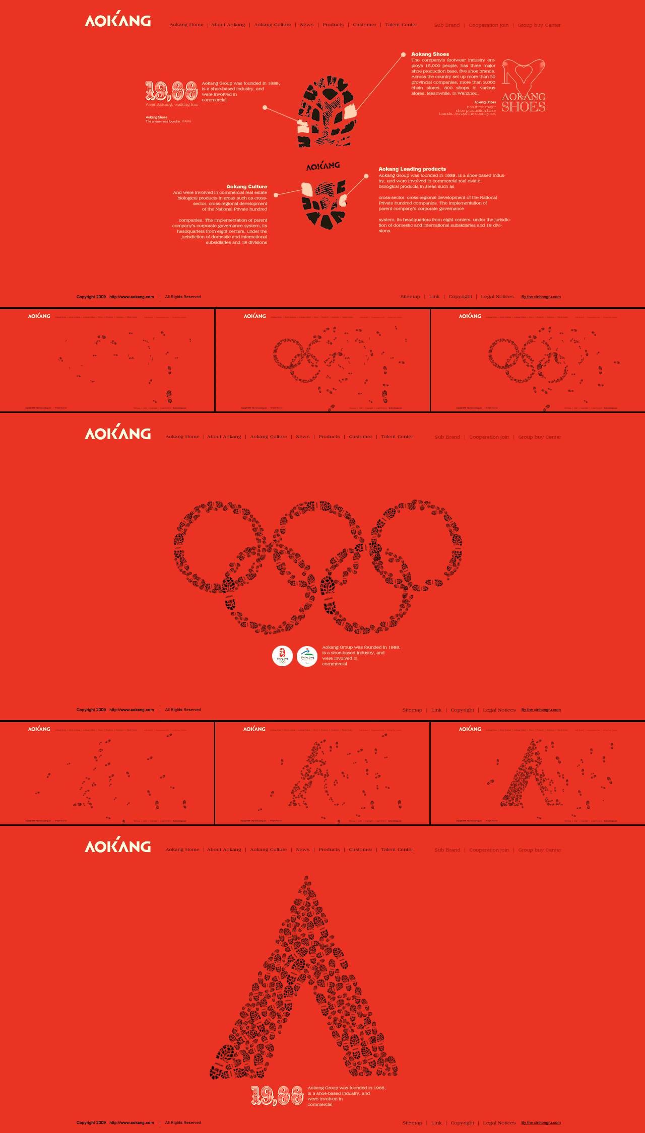 如圖所示,新鴻儒根據(jù)奧康集團(tuán)所在行業(yè)優(yōu)勢,將企業(yè)發(fā)展核心配合鞋印動態(tài)展示,生動直觀;又結(jié)合奧康集團(tuán)作為2008年奧運(yùn)贊助商這一特征,以鞋印組成奧運(yùn)五環(huán),放大其奧運(yùn)精神;最終,鞋印組合為奧康集團(tuán)標(biāo)志性logo,升華企業(yè)文化。