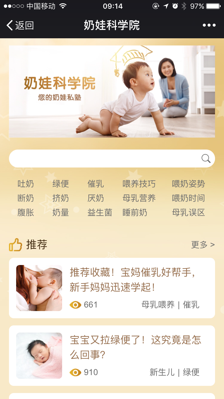 【奶娃科學(xué)院】是一檔專業(yè)知識欄目,新鴻儒通過分析行業(yè)大數(shù)據(jù)以及用戶需求,制定了整個欄目的標(biāo)簽方案,以不同緯度的關(guān)鍵詞,撰寫深度奶娃文章,帶給媽媽們更專業(yè)、更科學(xué)的答案;