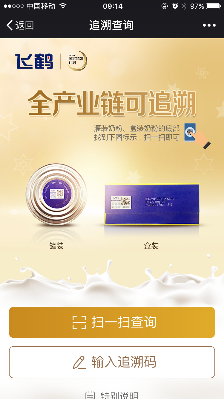【產(chǎn)品追溯】對接產(chǎn)品生產(chǎn)系統(tǒng),支持用戶實時查詢每一罐奶粉的出處,讓寶寶喝得更放心,媽媽更安心。