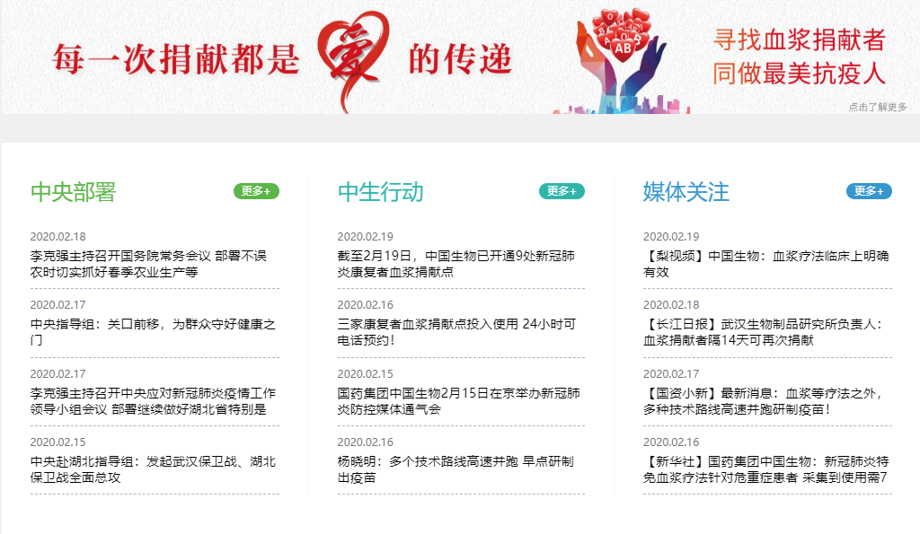 新鴻儒為中國(guó)生物所制作的專(zhuān)題欄目,首先,響應(yīng)國(guó)家中央部署,承擔(dān)央企使命,第一時(shí)間更新中央下達(dá)意見(jiàn);第二,在中國(guó)生物的研究下,捐獻(xiàn)血漿成為重中之重,號(hào)召與查詢(xún)?nèi)肟谛桴r明可見(jiàn);第三,防疫知識(shí),是大眾最關(guān)心的部分,足夠?qū)I(yè)貼心的防疫知識(shí),可穩(wěn)定人心;最后,群眾關(guān)注、媒體關(guān)注的進(jìn)程動(dòng)態(tài)實(shí)時(shí)更新。