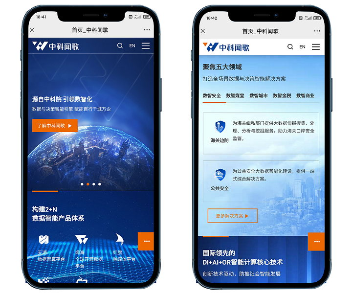 中科聞歌整體頁面設(shè)計(jì)簡潔大氣,延續(xù)品牌VI色調(diào),構(gòu)建統(tǒng)一視覺識別體系。整體網(wǎng)站架構(gòu)充分考慮訪問者需求,以“核心產(chǎn)品、解決方案、服務(wù)支持、合作伙伴、成功案例”為重點(diǎn)欄目,多形式呈現(xiàn),多終端適配,符合用戶的閱讀瀏覽習(xí)慣,更利于獲取信息。